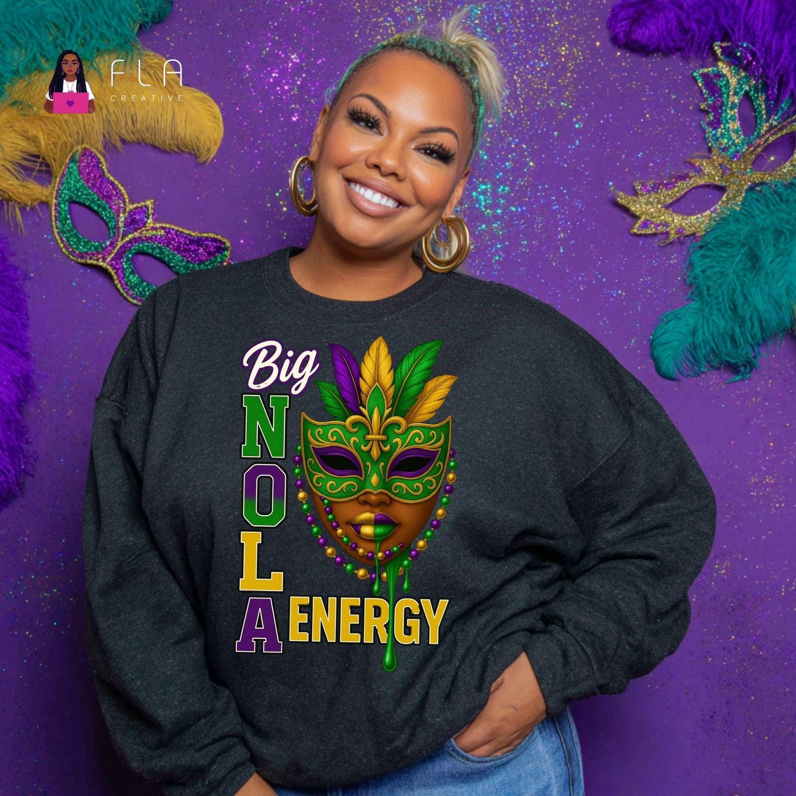Immerse yourself in the vibrant spirit of Mardi Gras with this Big NOLA Energy PNG, designed especially for New Orleans lovers who cherish the magic of parade season. This bold carnival mask graphic captures the essence of celebration, making it a perfect choice for Mardi Gras apparel and carnival party shirts. Whether you're crafting sublimation transfers or DTF print designs, this digital download brings festive energy to your creative projects.