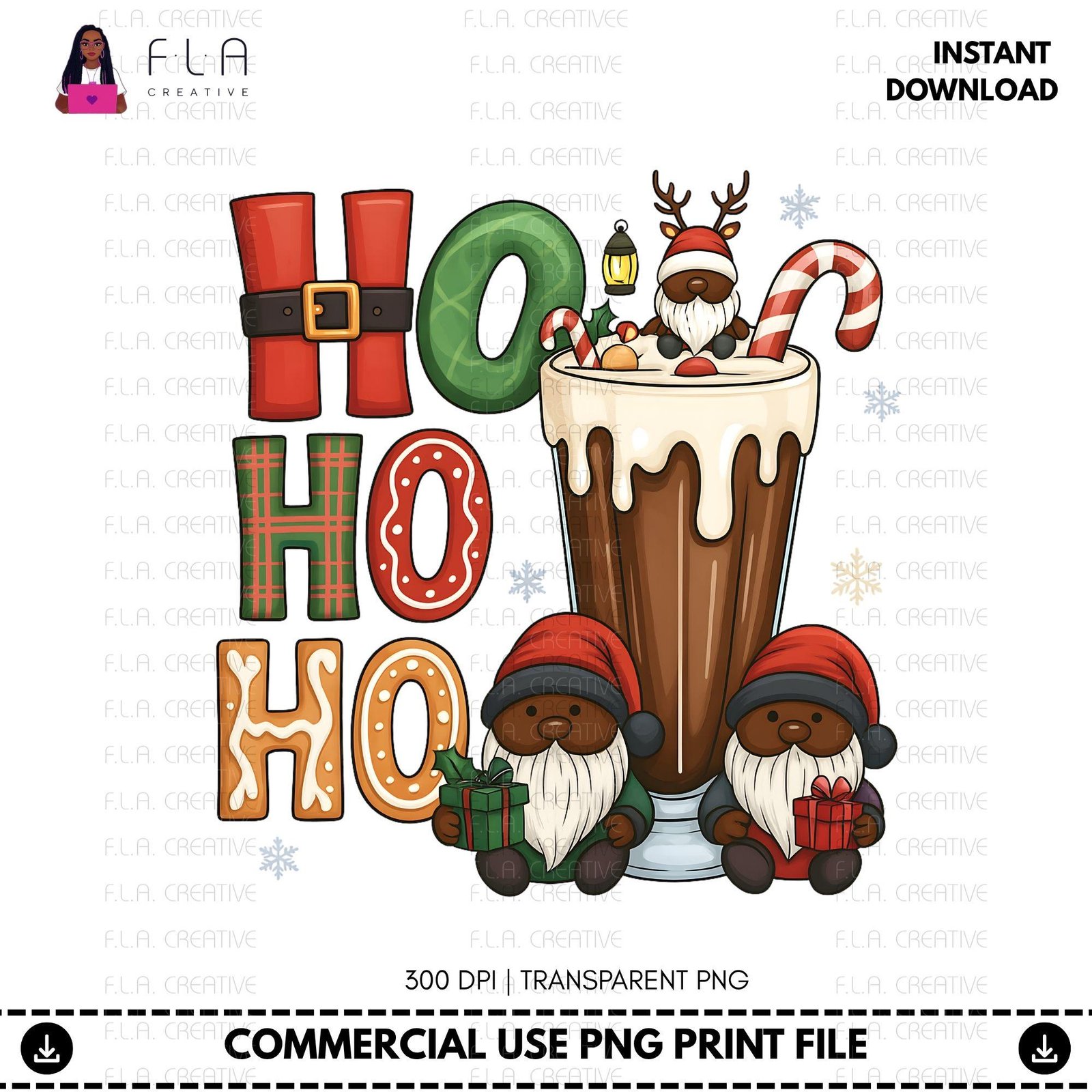 Celebrate the holidays with warmth, style, and representation! This Afrocentric “Ho Ho Ho” Black Santa Hot Cocoa PNG features playful holiday elements including chocolatey cocoa, candy canes, gingerbread, and adorable Black Santas in festive gear. It’s a joyful, inclusive design made for sublimation and DTF printing that looks stunning on t-shirts, hoodies, sweatshirts, and more.
