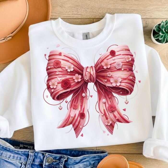 Celebrate the season of love with this enchanting faux yarn floral bow PNG, designed to infuse your projects with a romantic charm inspired by delicate rose bow clipart and coquette floral motifs. Each detail, from the soft pink and red roses to the subtle hearts and pearls, creates a dreamy aesthetic perfect for Valentine floral creations. Whether you're crafting sublimation art for shirts, mugs, or tumblers, this design brings a cute Valentine PNG vibe that’s both feminine and timeless.