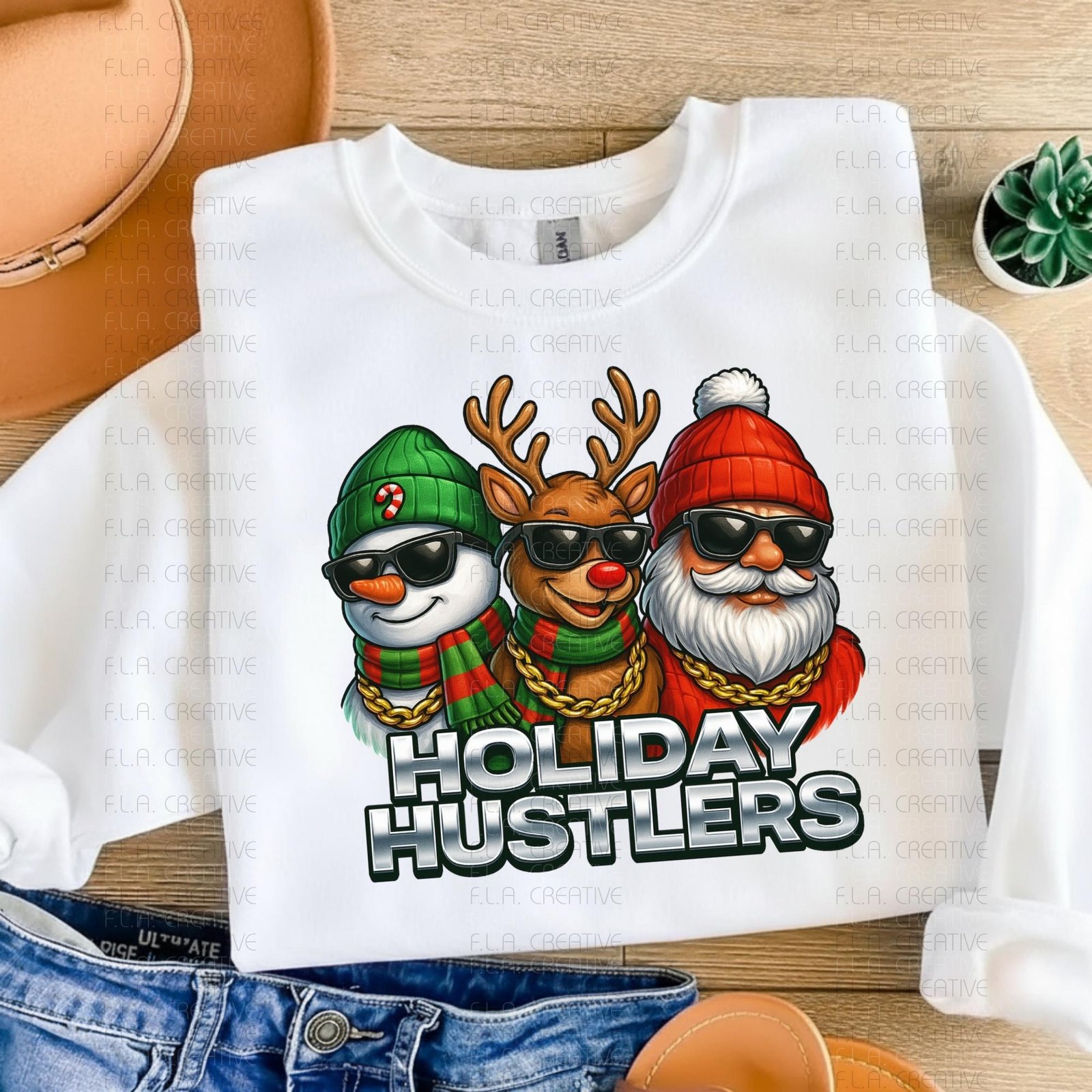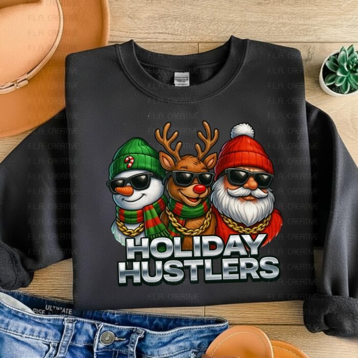 Holiday Hustlers PNG featuring Santa, a reindeer, and a snowman rocking gold chains, shades, and festive outfits.