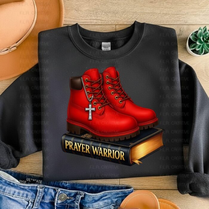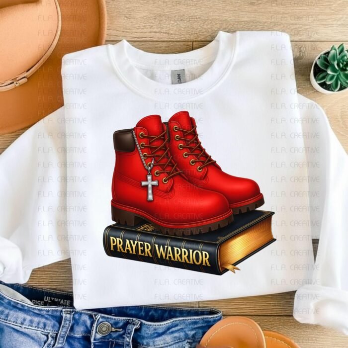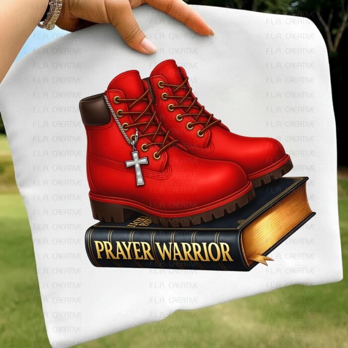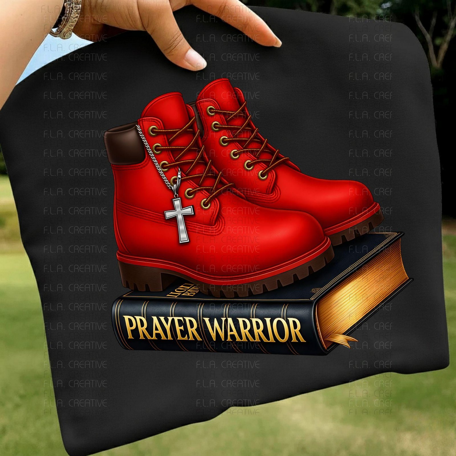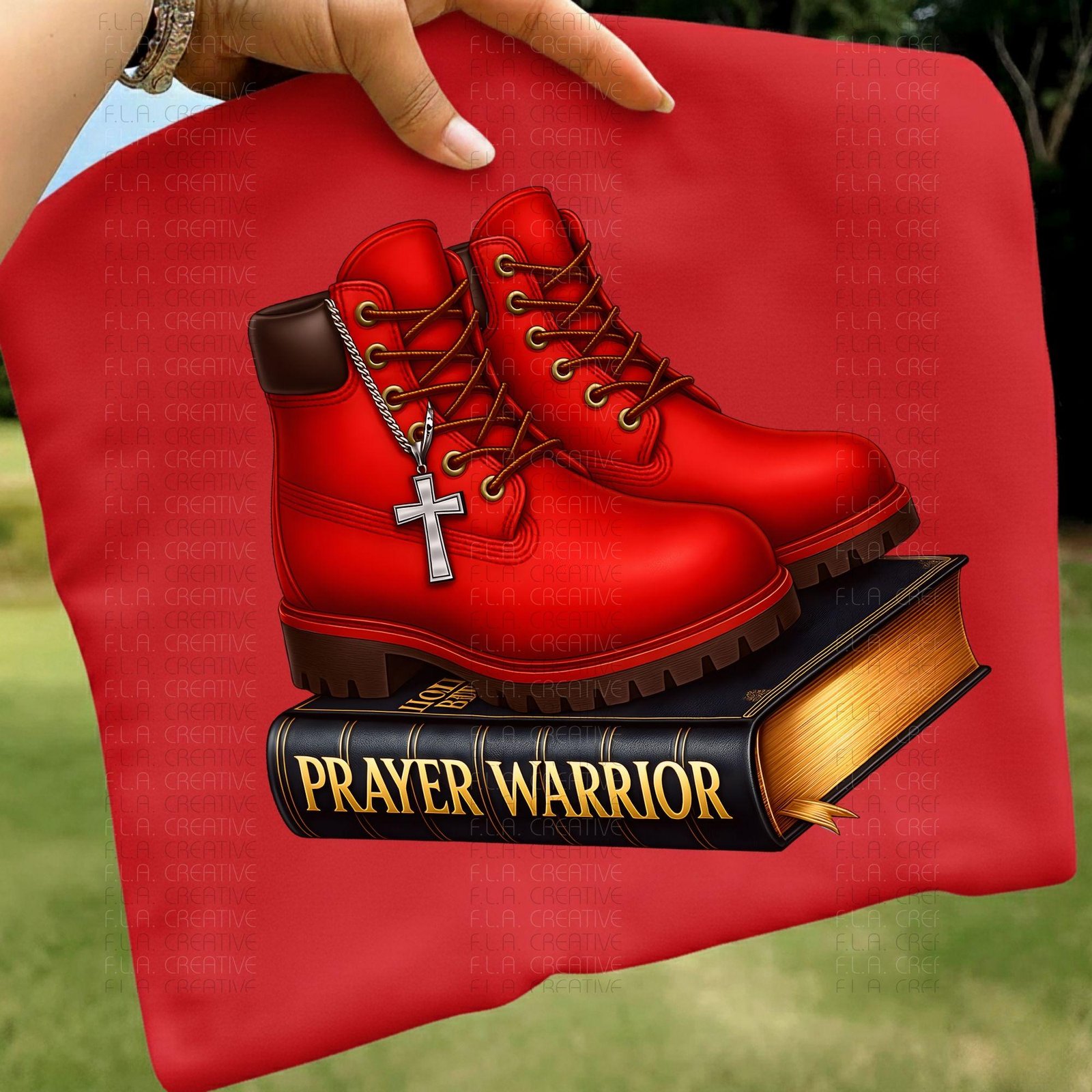 Prayer Warrior Red Boots PNG, Christian Clipart, Faith Sublimation Png, DTF Print, Cross Necklace Png, Gospel Shirt Design, Religious Art