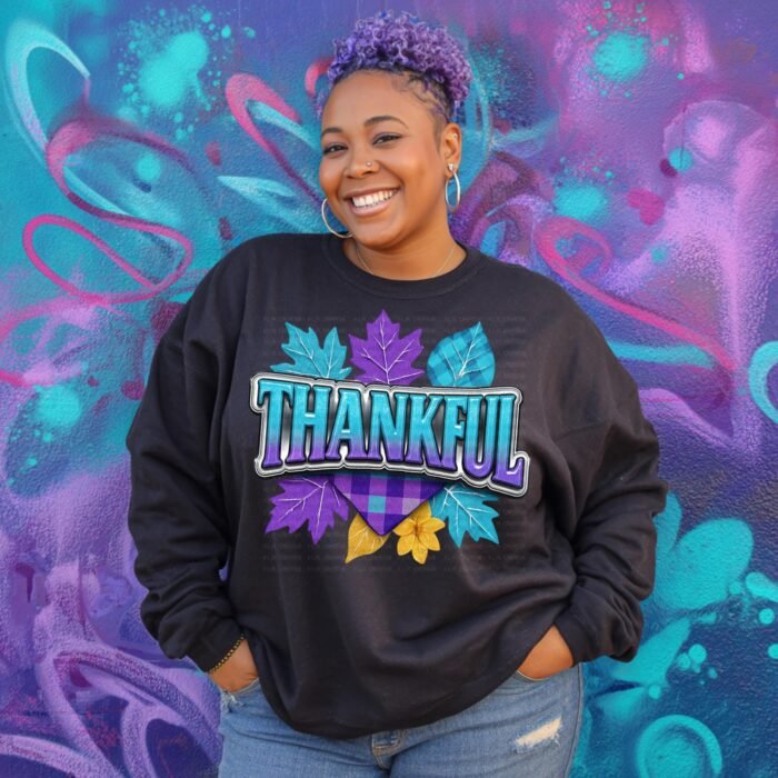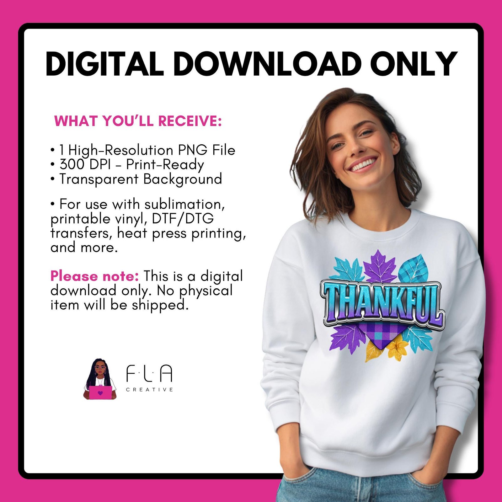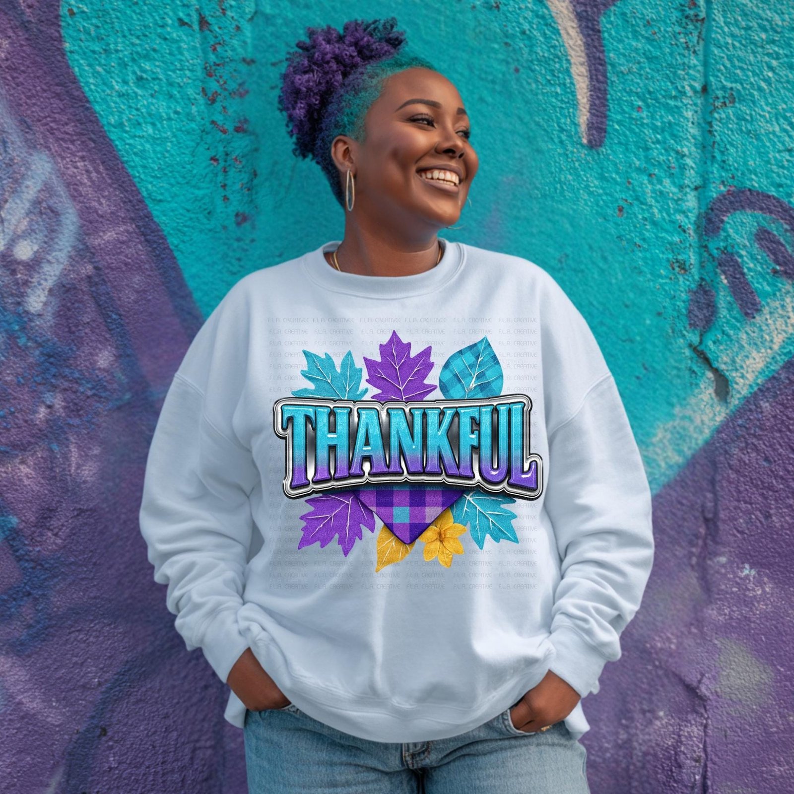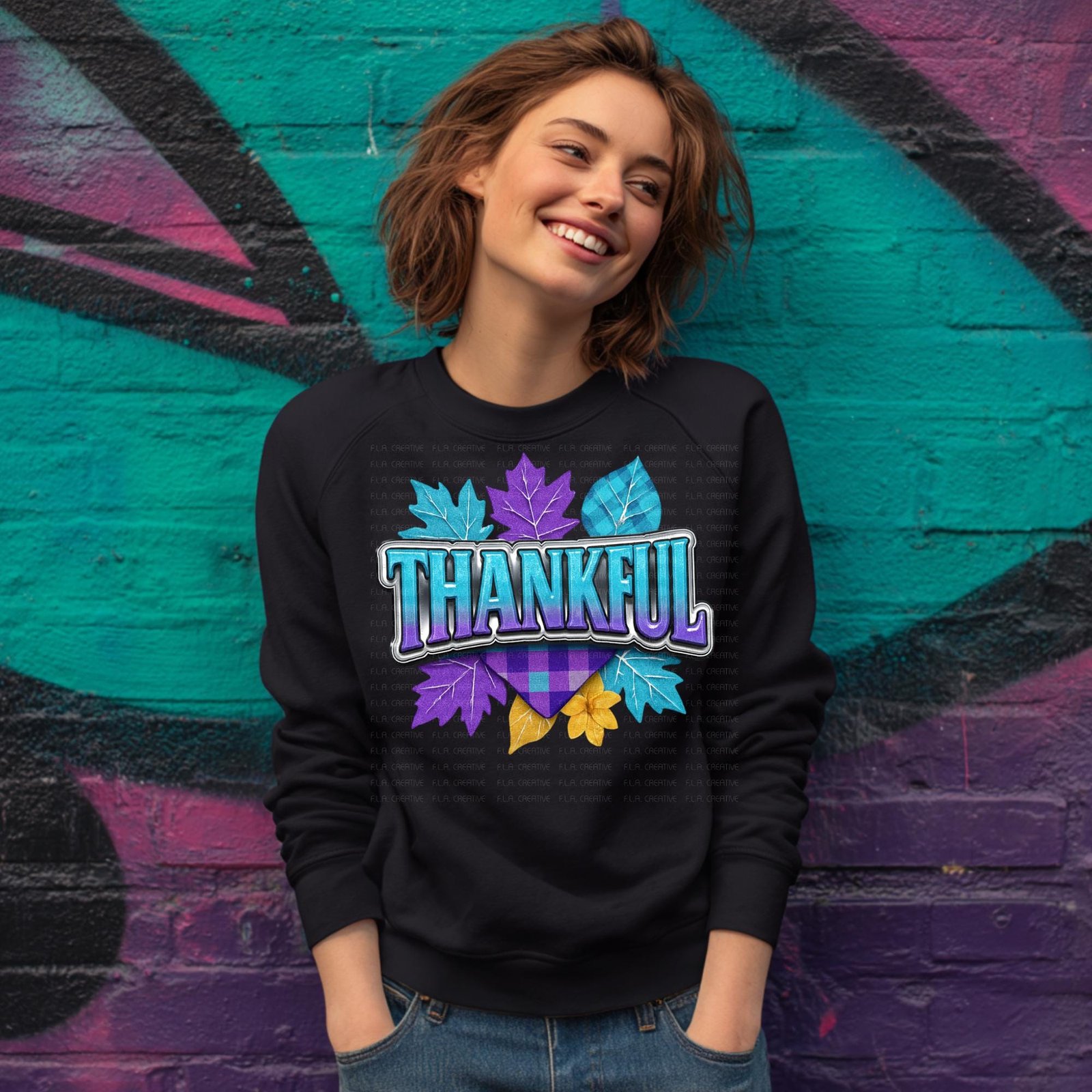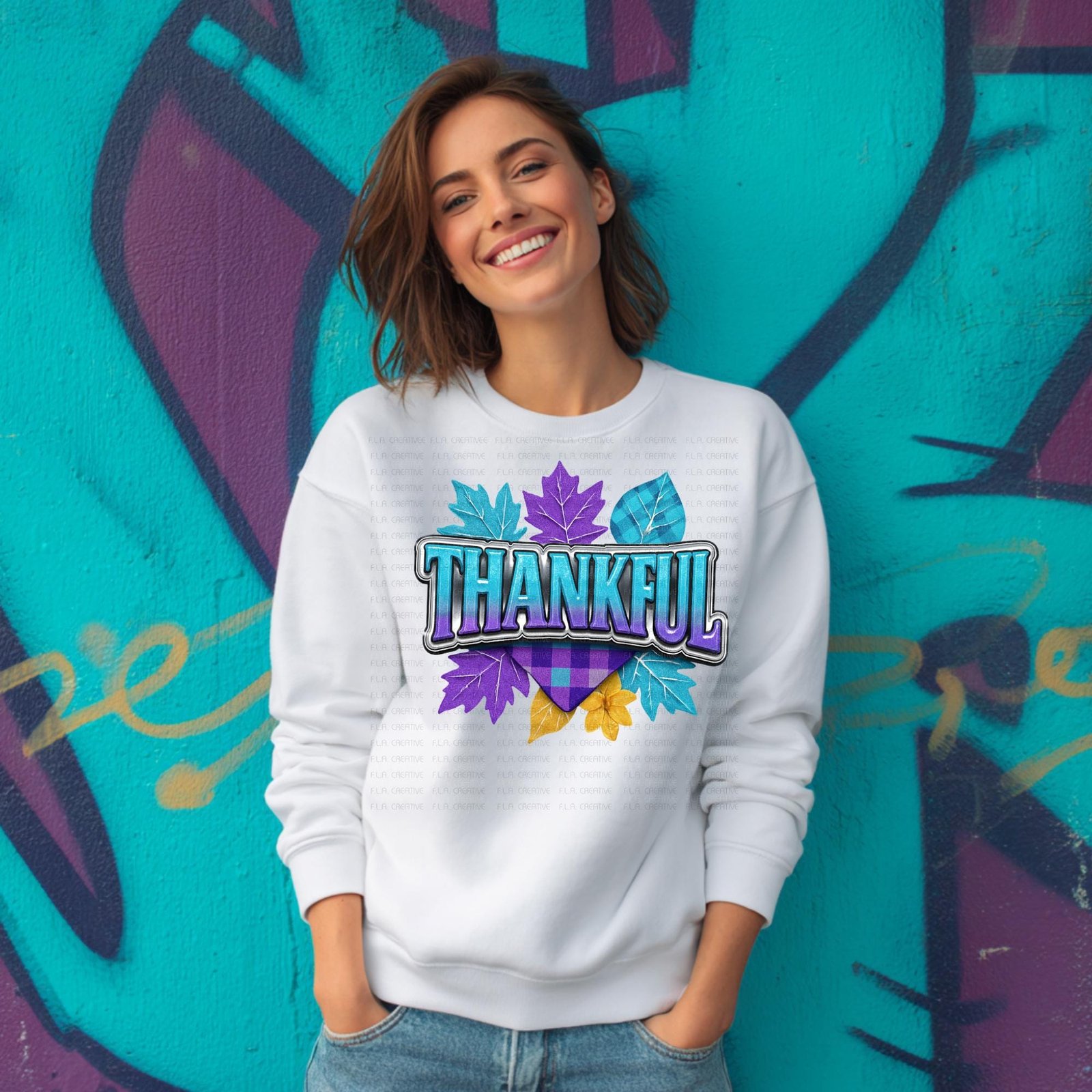 Celebrate gratitude and fall vibes with this Thankful PNG design! Featuring bold typography with purple and blue plaid accents surrounded by colorful autumn leaves, this design is perfect for Thanksgiving crafts, cozy apparel, and seasonal home décor.