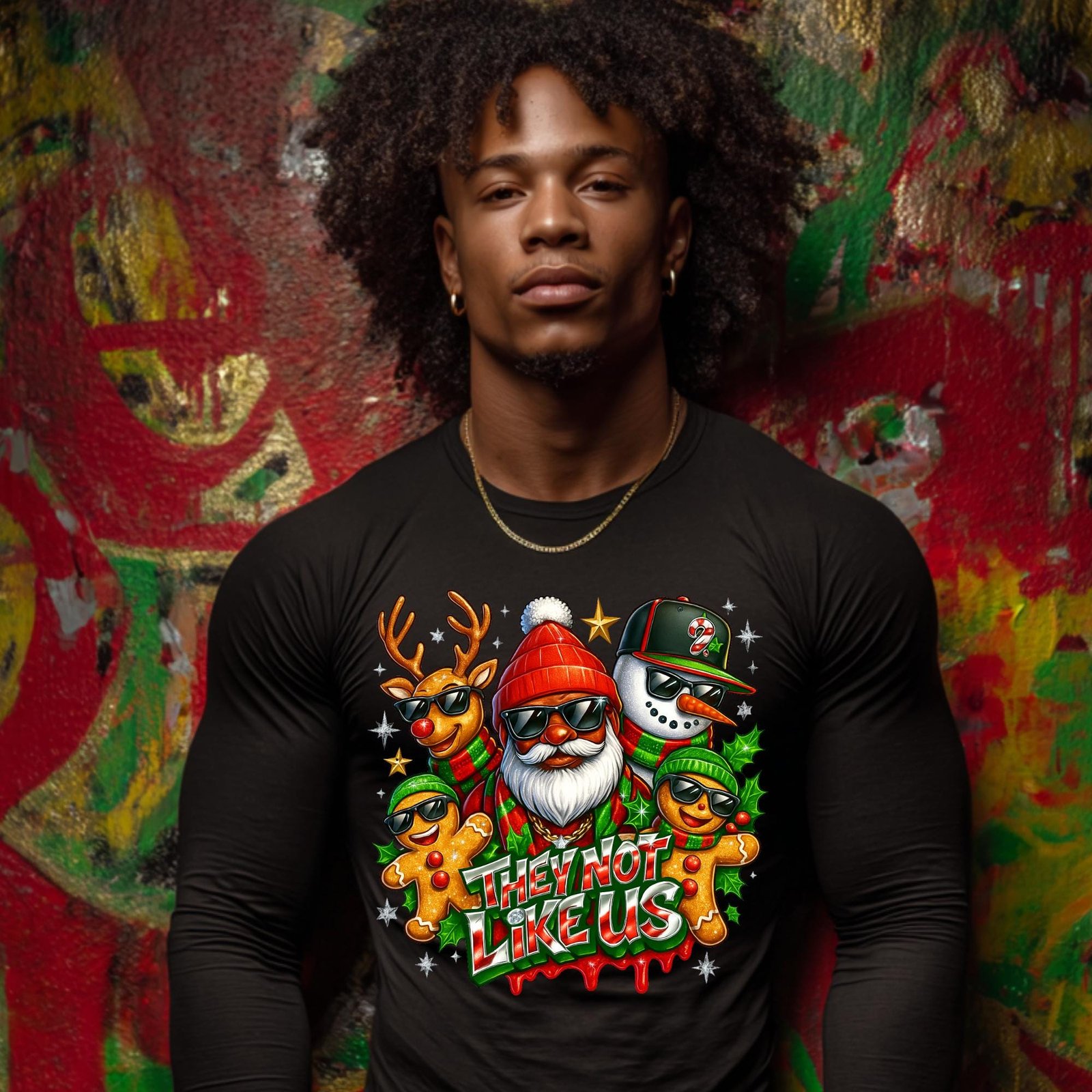 This “They Not Like Us” Christmas PNG features a cool Black Santa, reindeer, snowman, and gingerbread squad rocking shades and festive style!